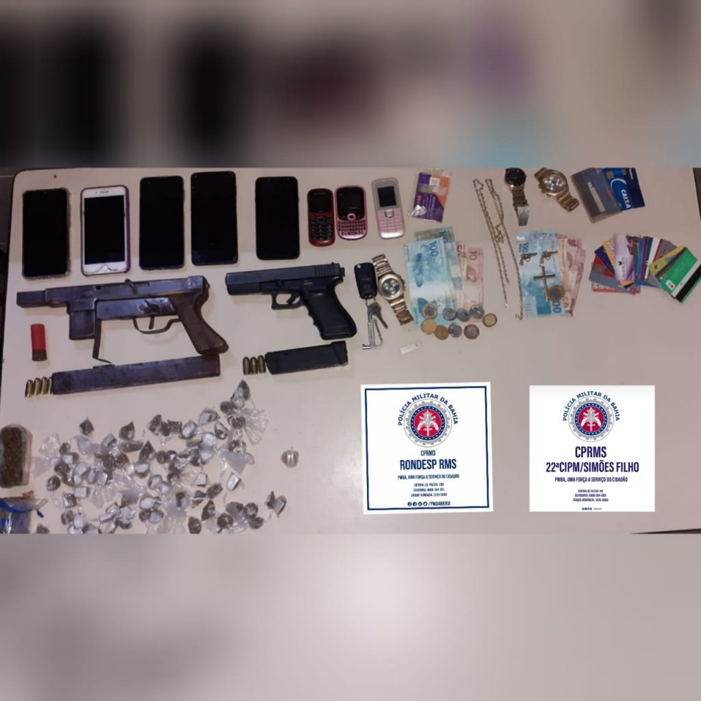 Com ele foram apreendidos uma pistola austríaca calibre 45, uma submetralhadora calibre 9mm, carregadores, munições, porções de drogas, celulares e 536 reais. O patrulhamento na região foi reforçado com unidades especializadas.