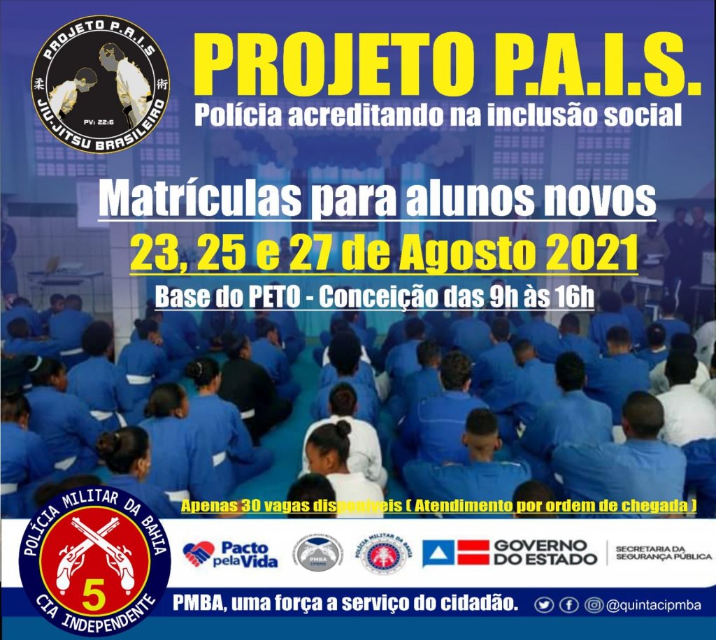 Pensando em formar novos cidadãos tendo a disciplina como papel principal, a 5ª Companhia Independente da Polícia Militar (CIPM/Vera Cruz) abrirá 30 vagas para o projeto Polícia Acreditando na Inclusão Social (PAIS), que oferece aulas de jiu-jitsu para crianças e adolescentes da comunidade de Vera Cruz, na Região Metropolitana de Salvador (RMS). As inscrições poderão ser feitas nos próximos dias 23, 25 e 27 de agosto.