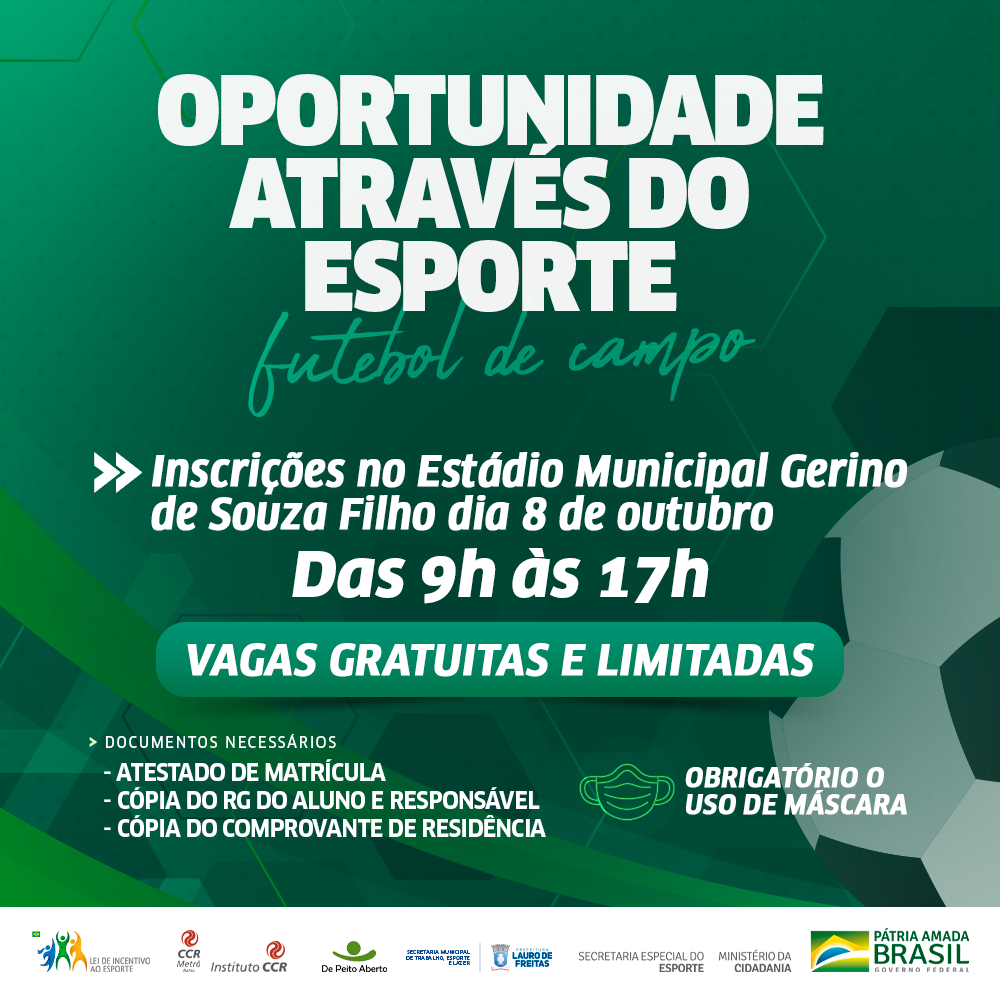 O projeto, vai oferecer gratuitamente aulas de futebol de campo para jovens com idade entre 7 e 17 anos. que vai disponibilizar 200 vagas para meninos e meninas, é uma ação do Instituto de Peito Aberto e será realizado no município em parceria com a Prefeitura de Lauro de Freitas.