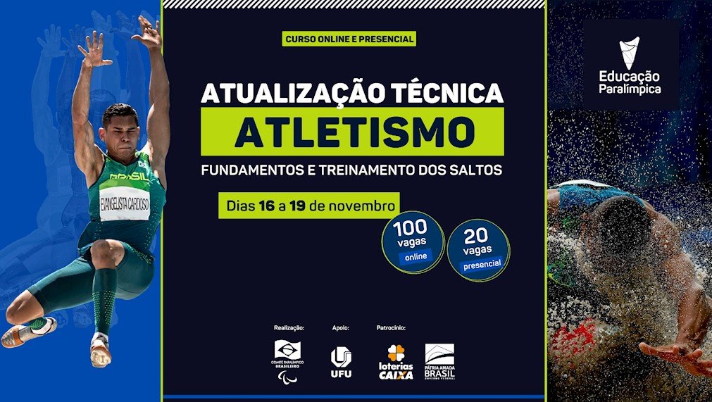 O Comitê Paralímpico Brasileiro (CPB), por meio da sua área de Educação Paralímpica, está com inscrições abertas para o curso de atualização técnica em atletismo – fundamentos e treinamentos dos saltos. As aulas serão em novembro e terão formato online e presencial, e as matrículas poderão ser realizadas por meio do site da Educação Paralímpica até o próximo dia 10 de novembro.