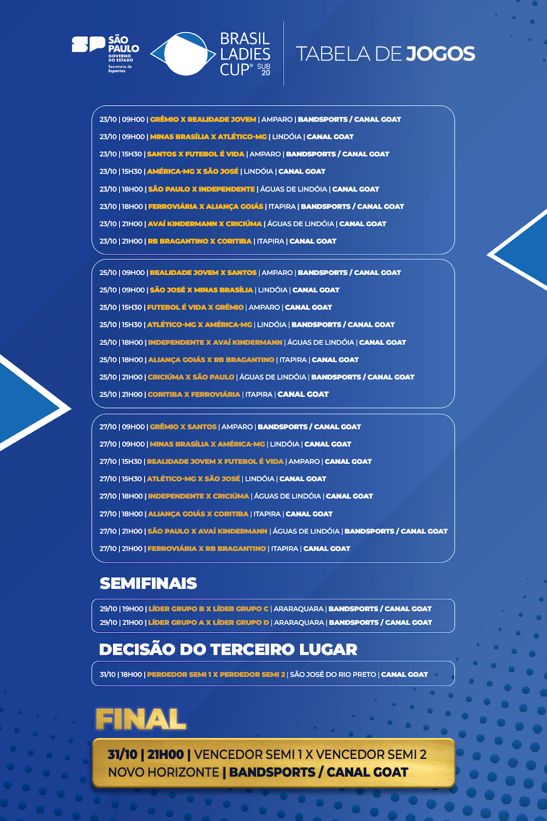 A Brasil Ladies Cup Sub-20 acontece entre os dias 23 e 31 de outubro, no interior de São Paulo. Nesta primeira fase, o torneio conta com 16 equipes, divididas em quatro grupos. Os líderes de cada chave avançam para as semifinais e os jogos eliminatórios serão decididos em partidas únicas. A transmissão da competição é realizada pelo canal de streaming esportivo GOAT e pelo BandSports