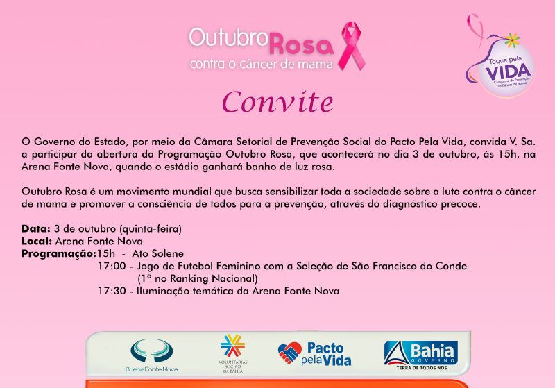 A partir dessa quinta-feira, 3, a Arena Fonte Nova será totalmente iluminada com a cor rosa, em homenagem ao movimento que busca promover a conscientização a respeito do câncer de mama e sua prevenção, o Outubro Rosa. A ação faz parte da agenda de atividades promovidas pelo Governo do Estado, por meio da Câmara Setorial de Prevenção Social do Pacto pela Vida(CSPS/PPV). A cerimônia de abertura será às 15h, no salão Loung Prêmio – Arena Fonte Nova, com a participação de representantes das secretarias estaduais e entidades parcerias do movimento. Após o ato solene, às 17h, será realizada uma partida de futebol com o Esporte Clube São Francisco do Conde, time feminino do município de São Francisco do Conde, e participação das cantoras Carla Visi, Margareth Menezes e Claudia Cunha. Às 17h30, o estádio receberá a nova iluminação, que se estenderá até o dia 11 de outubro.